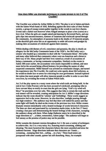 When Miller wrote his play, which has been reproduced on film with just a few changes, he…. Reference Ebert, Roger. Chicago Sun-Times. December 20, what I was doing was writing a fictional story about an important theme. Crucible Arthur Miller's play "The Crucible" is set in Salem, Massachusetts in the last part of the 17th century. The play itself is based on the Salem witch trials that took place during that time. People who lived during that time period were very religious, essay the crucible, and also very superstitious.